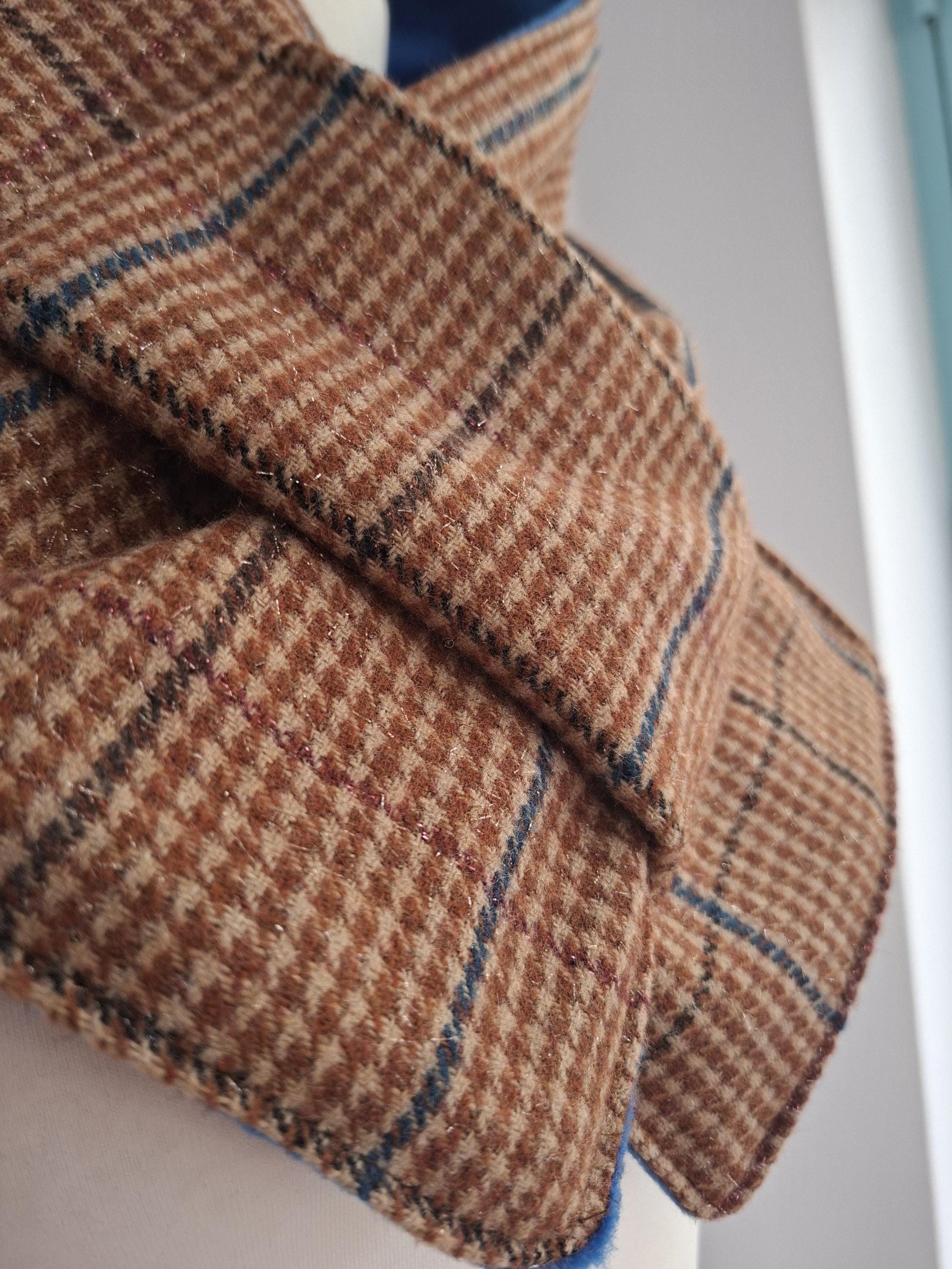 The external fabric is tartan pied de poule wool-pes and internal fabric is soft blue fleece (100% polyester)